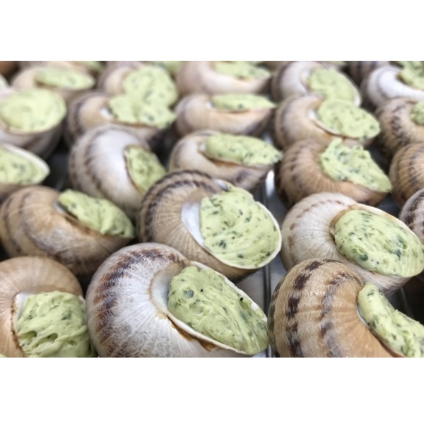 Ingrédients : chairs d’escargot (mollusque) 50% cuites dans un cour bouillon, beurre (lait) 41,6%, ail, persil, échalote, sel, poivre